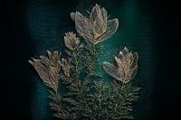 Een verfijnd en mysterieus kunstwerk waarin botanische vormen tot leven komen in elegante, goudachtige lijnen. De bloemen lijken bijna gegraveerd en contrasteren prachtig met de diepe, donkergroene achtergrond.