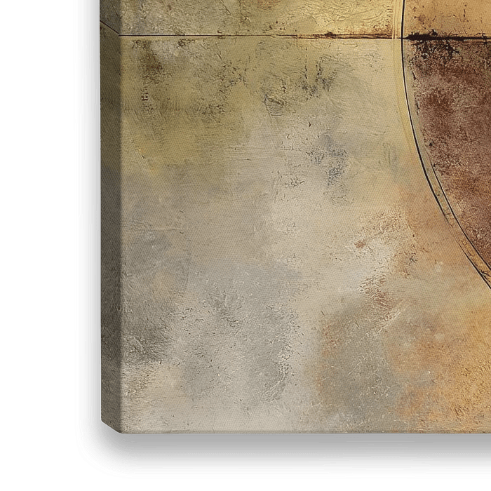 Een abstract schilderij in beige, goud, bruin en roest met een grote cirkelvorm straalt warmte en diepte uit. Een tijdloos abstract werk dat kracht en verfijning oproept.