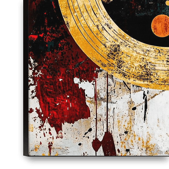 Een krachtig abstract kunstwerk dat direct de aandacht trekt. De combinatie van gouden cirkels met dynamische penseelstreken in rood, zwart, turquoise en wit creëert een energieke en moderne uitstraling. Dit ontwerp is perfect voor liefhebbers van hedendaagse kunst en voegt een vleugje luxe en creativiteit toe aan elke ruimte. Of het nu…
