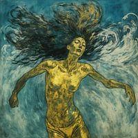 In dit fascinerende hedendaagse schilderij danst een vrouw met een gouden huidskleur op het ritme van de wind. Haar wilde haren stromen vrij, geanimeerd door de windvlagen, en creëren een sfeer van vrolijke beweging. De kunstenaar legt haar essentie vakkundig vast in levendige streken, waarbij hij goud en azuurblauw mengt om een scène…