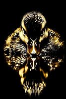 Dit kunstwerk toont een opvallende en realistische close-up van een eend, prachtig weergegeven met goudachtige accenten en een indrukwekkende reflectie. De donker getinte achtergrond versterkt het dramatische effect, waardoor de aandacht volledig op de details van het dier wordt gericht. Het contrast en de verfijnde details maken dit…