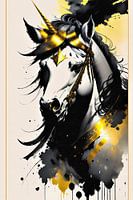 De hoorn van deze eenhoorn is van goud, Ook de manen bestaan uit gouden lokken. De rest is uitgevoerd in zwart wit met een warmgele gloed.
