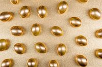 Deze fotografische compositie toont gouden eieren die gelijkmatig zijn gerangschikt op een glinsterend oppervlak. De metallic coating van de eieren weerkaatst het licht op een elegante manier en geeft het motief een luxueus en feestelijk karakter. De combinatie van goudkleurige objecten en een glinsterende achtergrond creëert een visuele harmonie van structuur, glans en textuur. De geometrische opstelling versterkt het gevoel van orde en helderheid, terwijl de reflecterende elementen diepte en visuele spanning creëren. Het oppervlak van de eieren is glad en glanzend en contrasteert met de getextureerde glitterbasis, wat de fotografische verfijning benadrukt. Het kleurenpalet van goud, beige en champagne creëert een warme en verfijnde sfeer. Deze foto is bijzonder geschikt voor designliefhebbers, fotografen en verzamelaars die houden van minimalistische objecten met een symbolisch effect. De eieren symboliseren potentieel, oorsprong en transformatie en hun gouden afwerking geeft ze een speciale betekenis. Als decoratief kunstwerk is de compositie ideaal voor moderne interieurs, stijlvolle presentatieruimtes of conceptuele tentoonstellingen. De heldere lijnen en het abstracte perspectief geven het werk een tijdloze esthetische kwaliteit die functie en symboliek combineert. De aandacht voor detail, de verlichting en het doordachte ontwerp maken dit beeld tot een aantrekkelijk motief voor iedereen die de schoonheid van eenvoudige vormen met een hoogwaardig oppervlak waardeert.