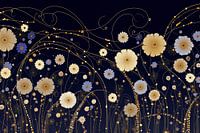 Dit werk toont een verzameling van gouden en blauwe bloemen die sierlijk verspreid zijn over een donkere achtergrond. De bloemen zijn verbonden door dunne, goudkleurige lijnen die een gevoel van beweging en vloeiendheid creëren. De combinatie van de gedetailleerde bloemen en de subtiele lijnen geeft het werk een elegante en verfijnde…