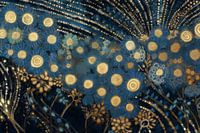 Dit werk toont een verzameling van gouden en blauwe bloemen die over het canvas verspreid zijn. De bloemen zijn gedetailleerd met cirkelvormige patronen en stippen, wat een gevoel van textuur en diepte geeft. Op de achtergrond zijn stralen van licht te zien, wat een dynamisch en stralend effect creëert.