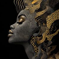 opvallend portret dat abstracte patronen combineert met een verfijnd gevoel voor detail. Het gezicht van de vrouw is gestileerd met een mozaïek van stippen en golvende lijnen, wat een dynamisch en bijna hypnotiserend effect creëert. De zwarte achtergrond versterkt de gouden accenten en patronen die door het gezicht en het haar stromen,…