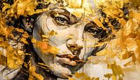Dit kunstwerk straalt een overweldigende intensiteit uit, waarin gouden fragmenten een mysterieus aura creëren rond het gezicht van de geportretteerde vrouw. De gouden lagen, schijnbaar willekeurig verdeeld over het schilderij, geven de indruk van gebroken spiegels of maskerachtige elementen die zowel verbergen als onthullen. Ze weerkaatsen licht en energie, en betrekken de kijker in een dialoog tussen realisme en abstractie. De warme, gouden tinten contrasteren met de koele schaduwen en de nauwkeurig bewerkte ogen, die het gezicht diepte en een melancholische intimiteit geven.