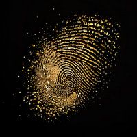 Prachtige weergave van een vingerafdruk, goudkleurig met glitters op een zwarte achtergrond.