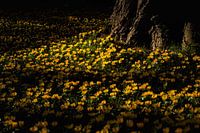 Een tapijt van gele bloemen baadt in het warme zonlicht aan de voet van een imposante boom. De diepe schaduwen en de goudgele tinten creëren een sprookjesachtige sfeer, alsof je zo een magisch bos in stapt. Dit werk roept een gevoel van verwondering en rust op. Perfect voor natuurliefhebbers die houden van rust en diepte in hun interieur.