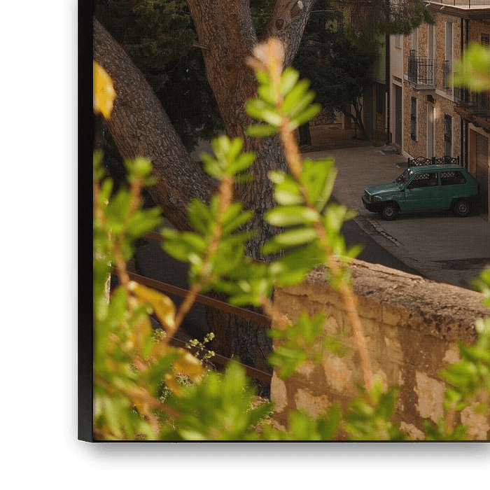 De warme zon werpt haar gouden gloed op de gevels van oude huizen, terwijl een klassieke auto geparkeerd staat onder de schaduw van hoge pijnbomen.