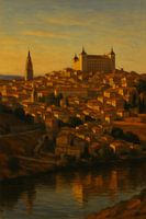 Toledo's Gouden Gloed toont het middeleeuwse juweel van Spanje verlicht door het amberkleurige vuur van de schemering. Het Alcázar steekt boven de daken uit en de torens vangen de laatste zonnestralen op. Beneden weerspiegelt de rivier de Taag de warme tinten van de stad, waardoor een serene weerspiegeling van geschiedenis en tijd ontstaat.