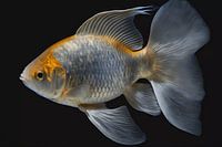 Das Bild mit dem Titel „Goldene Anmut“ zeigt einen einzelnen Goldfisch vor einem tiefschwarzen Hintergrund, wodurch ein auffälliger Kontrast entsteht, der die Aufmerksamkeit sofort auf die Eleganz des Motivs lenkt. Der Fisch ist im Profil dargestellt, sodass man seine gesamte Form von Kopf bis Schwanz bewundern kann. Sein Körper zeigt…