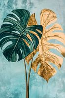In een harmonieuze dans van groen en goud presenteren de bladeren zich majestueus tegen een zachte, aquamarijnkleurige achtergrond. Het weelderige gebladerte straalt vitaliteit uit, terwijl het gouden oppervlak een vleugje elegantie en luxe belichaamt. Een fascinerend samenspel van de natuur dat de ruimte zowel bedaart als verfraait.
