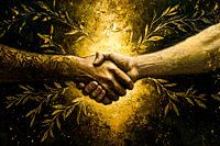 Dit indrukwekkende kunstwerk straalt warmte en verbinding uit door de krachtige afbeelding van een handdruk. Omgeven door gouden bladeren en een rijke, warme achtergrond, symboliseert dit ontwerp samenwerking, vertrouwen en natuur. Perfect voor een moderne woonkamer of kantoorruimte, het voegt een gevoel van verfijning en betekenis toe…