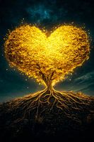 Een adembenemend ontwerp dat een gouden, hartvormige boom toont die straalt in een mysterieuze nachtelijke omgeving. De schitterende bladeren lijken bijna te gloeien, terwijl de hemel op de achtergrond bezaaid is met sterren, wat een magische sfeer creëert. Perfect voor liefhebbers van kunst en natuur, en een ideale keuze om elke ruimte…