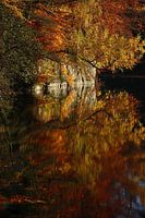 Prachtig gloeiend herfstbos weerspiegeld in het meer.