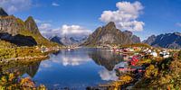 In september kleuren de bladeren op de Lofoten in herfsttinten. Het panorama van het schilderachtige berglandschap wordt weerspiegeld in de Reinefjord op de Lofoten in het uiterste noorden van Noorwegen. Het vissersdorp Reine ligt perfect ingebed in het spectaculaire landschap.