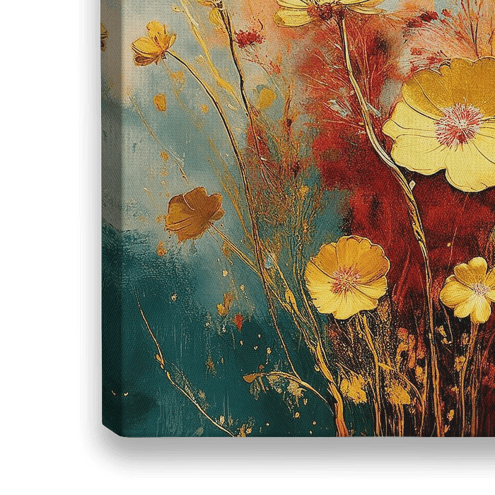 De bloemen en grassen van stralend goud met daarbij de warme kleuraccenten groen en zeer donker rood op een naturel/licht petrol blauwe achtergrond.
