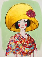 Een digitaal portret van een moderne vrouw met gouden bucket hoed. Om haar schouders draagt zij een sjaal welke is opgebouwd uit een een laag van een door mij vervaardigd acrylverf schilderij met spatten.