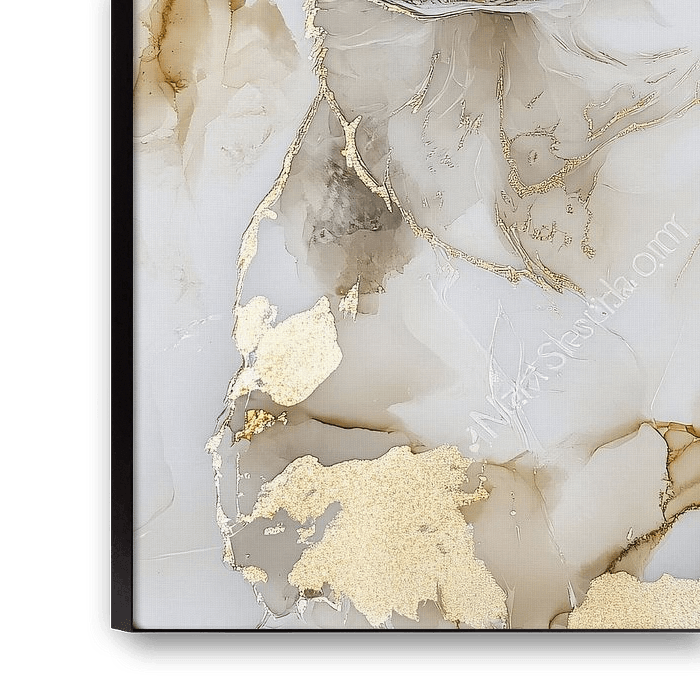 Dit prachtige kunstwerk toont een gedetailleerde afbeelding van een hond, omlijst met subtiele goudaccenten die een luxueuze uitstraling geven. Het ontwerp heeft een zachte, neutrale achtergrond in beige en wit, waardoor de warme gouden details van de hond extra naar voren komen. De realistische weergave van de hond gecombineerd met de abstracte gouden lijnen maakt dit kunstwerk zowel modern als tijdloos. Ideaal voor liefhebbers van dieren en elegantie, en perfect om een stijlvolle en serene sfeer te creëren in elke ruimte. Hang het in een kantoor of slaapkamer voor een vleugje rust en verfijning.