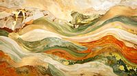 Warme tinten van oker, olijfgroen en terracotta wisselen elkaar af, met subtiele gouden penseelstreken die het licht vangen en een verfijnde glans toevoegen.