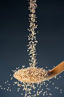 In deze expressieve studio-opname vallen talloze kleine, hele mosterdzaadjes dynamisch op een rustieke, oude houten lepel. De beweging van de korrels werd bevroren met hogesnelheidsflitsen, waardoor elke afzonderlijke korrel duidelijk en gedetailleerd te zien is. De donkerblauw-grijze achtergrond met een zachte gradiënt vormt een elegant contrast met de warme, goudgele kleur van de mosterdzaadjes. De rustieke structuur van de houten lepel benadrukt de natuurlijke uitstraling van het tafereel. Dit motief combineert dynamiek en authenticiteit en is perfect voor culinaire thema's, foodstyling of stijlvolle wanddecoraties in de keuken- en cateringsector.