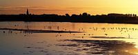 Baarzandse kreek tussen Breskens en Schoondijke. De kerktoren van Groede op de achtergrond. Vogels fourageren de hele dag in de ondiepe kreek, en genieten nu van de gouden schemering.
