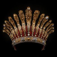 De kroon staat centraal tegen een diepe, zwarte achtergrond, waardoor de prachtige kleurtinten nog intenser tot hun recht komen. Het contrast tussen het glanzende goud en de donkere achtergrond zorgt voor een indrukwekkend visueel effect. Met de warme goudtinten en de zachte lijnen van de veren ontstaat een tijdloos en evenwichtig ontwerp dat rust én klasse uitstraalt.