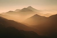 In dit verstilde berglandschap vloeien lagen van licht en schaduw zacht in elkaar over. De bergen rijzen op in warme aardetinten, hun contouren steeds zachter naarmate ze verdwijnen in de nevel. Het gouden licht omhult de valleien en geeft het geheel een rustige, bijna ademende cadans. Alles lijkt hier vertraagd, alsof de tijd zich…