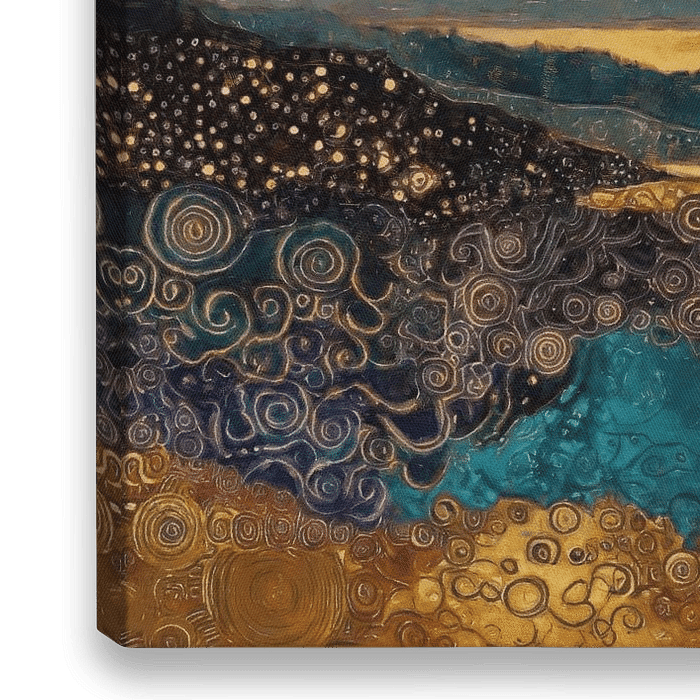 Een majestueuze berg met besneeuwde top torent boven een landschap van glinsterend goud en diepe blauwtinten. De rivier slingert zich sierlijk door de vallei, omgeven door abstracte patronen van cirkels en spiralen die doen denken aan Klimt’s ornamentiek. De lucht is rijk aan warme okertonen, met texturen die een dromerige sfeer…