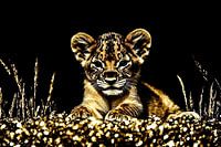 Een prachtig ontwerp met een gedetailleerd beeld van een jonge leeuw tegen een diepe, zwarte achtergrond. Het gouden licht dat de welp accentueert, creëert een sterk contrast en geeft een luxe uitstraling aan het geheel. Ideaal voor wie zijn interieur wil verrijken met een krachtig en stijlvol kunstwerk dat warmte en elegantie uitstraalt. Perfect als wanddecoratie voor in de woonkamer, het kantoor of zelfs de slaapkamer. Dit design trekt gegarandeerd de aandacht en brengt een vleugje natuur en verfijning in elke ruimte.