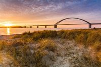 Het gouden licht schittert op het duingras en de wolken zijn in verschillende kleuren gekleurd.