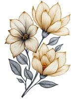 Deze elegante digitale illustratie toont drie gestileerde bloemen met delicaat, goudkleurig lijnwerk dat hun bloemblaadjes definieert. De bloemen hebben een donker hart met gouden details, die stampers en meeldraden suggereren. Ze worden vergezeld door gestileerde, grijsblauwe bladeren langs slanke stelen. De algehele esthetiek is verfijnd en modern, met de nadruk op de ingewikkelde lineaire patronen die de bloemvormen tot leven brengen.