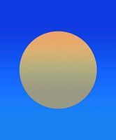 Een abstract maar minimaal schilderij van een gouden gloeiende maan in warme kleuren zoals goud, ivoor, beige, crème, koper, brons en andere op een zeer heldere blauwe achtergrond met fijne gradiënt en arceringen.