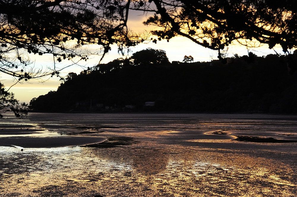 De silhouetten van de bomen langs de kust steken af tegen de lucht en geven de omgeving een dramatisch tintje. Het Coromandel schiereiland, bekend om zijn adembenemende landschappen, biedt een ideale achtergrond voor fotografieliefhebbers of reizigers die op zoek zijn naar authentieke momenten. De mix van sprankelend water, warm zand en weelderige vegetatie weerspiegelt de essentie van deze regio van Nieuw-Zeeland.