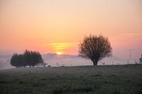 Ochtendlijke sfeer in Dresden, Niederwartha. De opkomende zon dringt door de mist en laat de ochtenddauw glanzen.