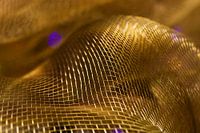 Deze macro-opname toont een fijn gestructureerd, glinsterend goudkleurig draadraster dat in zachte golven door het beeld loopt. Het oppervlak weerkaatst het licht op een subtiele manier en creëert een levendig spel van highlights en schaduwen. Kleine paarse lichtpuntjes op de achtergrond plaatsen specifieke kleuraccenten en geven de…