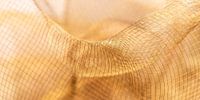Deze afbeelding toont een macro-opname van een goudkleurige netstof met een regelmatige rasterstructuur. De fijne lijnen van het materiaal kruisen elkaar in een duidelijk raster en vormen kleine, vierkante openingen. De gerichte verlichting creëert een warme, gouden tint die de structuur van de stof benadrukt en de driedimensionale vorm zichtbaar maakt. De lichte kromming van het materiaal geeft het beeld een subtiele dynamiek.