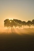 Een mistige oktober ochtend. De zon verschijnt langzaam door de bomen en de eerste zonneharpen vinden hun weg door een mistig landschap. Genomen in de Overijsselse IJsseldelta in oktober.