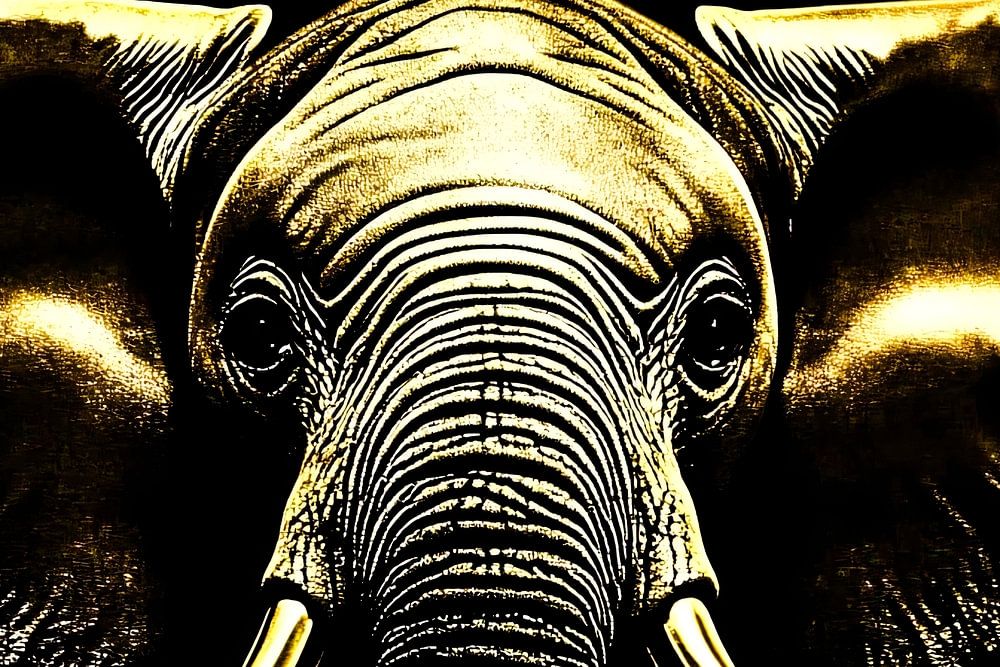 Dit ontwerp is een opvallend kunstwerk van een olifant in een strakke, gouden uitvoering tegen een zwarte achtergrond. De subtiele glans en gedetailleerde vormen geven het ontwerp een moderne uitstraling, die zowel luxe als kracht uitstraalt. Het gebruik van goud in combinatie met de diepe zwarte achtergrond creëert een dramatisch effect, waardoor de olifant centraal staat in het beeld. Het ontwerp heeft een minimalistisch karakter, wat de kracht en majestueuze uitstraling van de olifant versterkt. Dit kunstwerk is perfect voor een interieur waar verfijning en een vleugje exotische flair gewenst zijn. Of je nu een modern interieur hebt of een ruimte wilt opvrolijken met een krachtige symboliek, dit kunstwerk zal zeker de aandacht trekken.