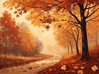 Dit is een digitaal schilderij dat de essentie van een serene herfstscène vastlegt. De compositie leidt de kijker langs een kronkelend pad door een bos dat baadt in warm, gouden licht. De bomen aan weerszijden zijn versierd met bladeren die overgaan van levendig geel en oranje naar dieper rood en bruin, wat het hoogtepunt van de herfst aangeeft. Het pad zelf ligt bezaaid met afgevallen bladeren, wat textuur en diepte toevoegt aan het tafereel. Een zachte mist of nevel verzacht de achtergrond en creëert een gevoel van diepte en rust. De handtekening van de kunstenaar's is zichtbaar in de linkerbenedenhoek, wat een persoonlijk tintje toevoegt. De algehele sfeer is vredig en nostalgisch en roept het knusse gevoel op van een frisse herfstdag.