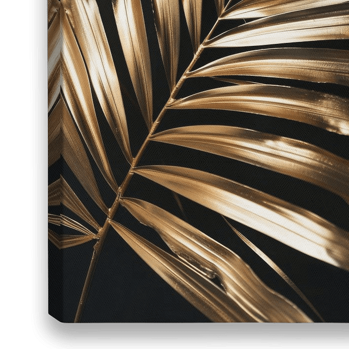 De gouden palmbladeren schitteren in majestueuze pracht en creëren een indrukwekkende compositie op een diepzwarte achtergrond. Deze afbeelding is meer dan een kunstwerk - het is een eerbetoon aan de tijdloze elegantie en eeuwigdurende schoonheid van de natuur. De gouden tinten, die het licht op een unieke manier weerkaatsen, geven de…