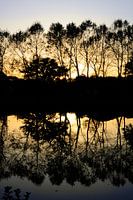 Een foto van bomen gereflecteerd in een vijver. De ondergaande zon achter de bomen geeft een warme gouden gloed in de lucht. De warme, windloze zomeravond maakt het water een spiegel.