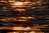 De foto met de titel "Golden Ripples" toont een close-up van het oppervlak van een waterlichaam dat de zon weerspiegelt. Het water is diepzwart, terwijl de zon een gouden gloed creëert. De rimpelingen op het water creëren een abstract patroon waardoor de foto bijna op een schilderij lijkt. Deze foto is ideaal om op te hangen in hotels,…