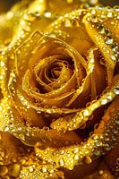 Deze prachtige close-up foto toont een gouden roos, nauwgezet gedecoreerd met fijne waterdruppels die het licht vangen en reflecteren. De warme, diepe gouden tinten van de roos vormen een schitterend contrast met de sprankelende helderheid van het water, wat een bijna magische sfeer creëert. Perfect voor liefhebbers van natuur en kunst, biedt dit stuk een unieke blik op de schoonheid die ontstaat wanneer twee elementen van de natuur elkaar ontmoeten. Een ideaal kunstwerk voor in de woonkamer of een stijlvolle kantoorruimte, waar het gegarandeerd gespreksstof oplevert en een gevoel van rust en bewondering brengt.