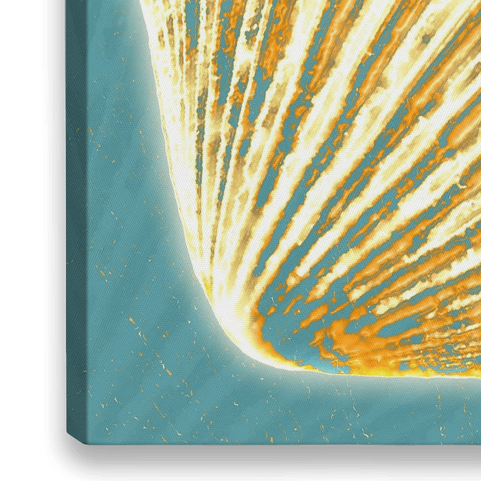 Een gouden schelp op de groenblauwe kleuren van de zee. In zeeschelpen aan het strand vind je dit natuurlijke waaiervormige patroon terug. In dit werk vermengt de schelp zich met de achtergrond.