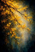 Dit boeiende kunstwerk neemt de toeschouwer mee naar een scène van dramatische schoonheid. Krachtige, gouden bladeren sieren delicate takken die zich elegant van boven naar beneden uitstrekken. De achtergrond is een diepe en mysterieuze mix van donkere tinten die naadloos in elkaar overvloeien en doen denken aan het gedempte licht van…