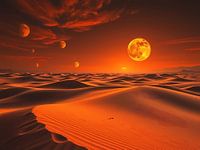 Dit levendige digitale schilderij legt de grimmige schoonheid en rustige sfeer van een woestijnlandschap vast. De afbeelding wordt gedomineerd door vloeiende rondingen en contrasterende schaduwen en concentreert zich op een reeks golvende zandduinen die baden in de warme gloed van een prominente zon. Het kleurenpalet is rijk en verzadigd, met diepe sinaasappels en bruintinten die de schaduwrijke hellingen van de duinen definiëren en overgaan in schitterend geel en oranje waar het zonlicht direct op valt. De minimalistische compositie benadrukt de eenvoudige maar majestueuze vormen van de natuur en creëert een gevoel van uitgestrektheid en vredige eenzaamheid. Op de achtergrond vervagen zachtere, wazige contouren van verre duinen en misschien laaggelegen bergen in de heldere, zonovergoten lucht, wat diepte toevoegt aan de scène. Het kunstwerk roept de hitte en stilte van de woestijn op en nodigt uit tot contemplatie van haar tijdloze en fascinerende allure.