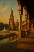 Sevilla's Golden Serenity vangt de lichtgevende pracht van Plaza de España in de zachte omarming van de avond. Zonlicht valt door de bogen en werpt ritmische patronen op de tegelvloer, terwijl de toren gloeit als gesmolten amber. De fontein glinstert in een zachte beweging, de weerspiegelingen smelten hemel en steen samen tot een…