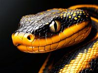 De schubben van de slang zijn intens zwart en goud gekleurd, wat de afbeelding een luxueuze en fascinerende uitstraling geeft. Het oog van de slang is groot en intens,…